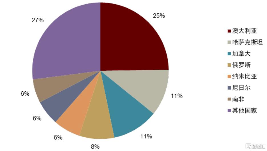► 尼日尔:2022年尼日尔共生产天然铀2020tU,占全球的4%,产量主要来自法国Orano在当地的Somair子公司,另外未投产的大型铀矿还包括Global Atomic旗下规划于2026年投产的Dasa铀矿,以及Orano已经被取消采矿权的Imouraren铀矿。2023年,受到西非共同体制裁和尼日尔关闭边境影响,尼日尔的Somair工厂暂停铀矿生产[13],对全球铀矿供给形成较为明显的扰动。