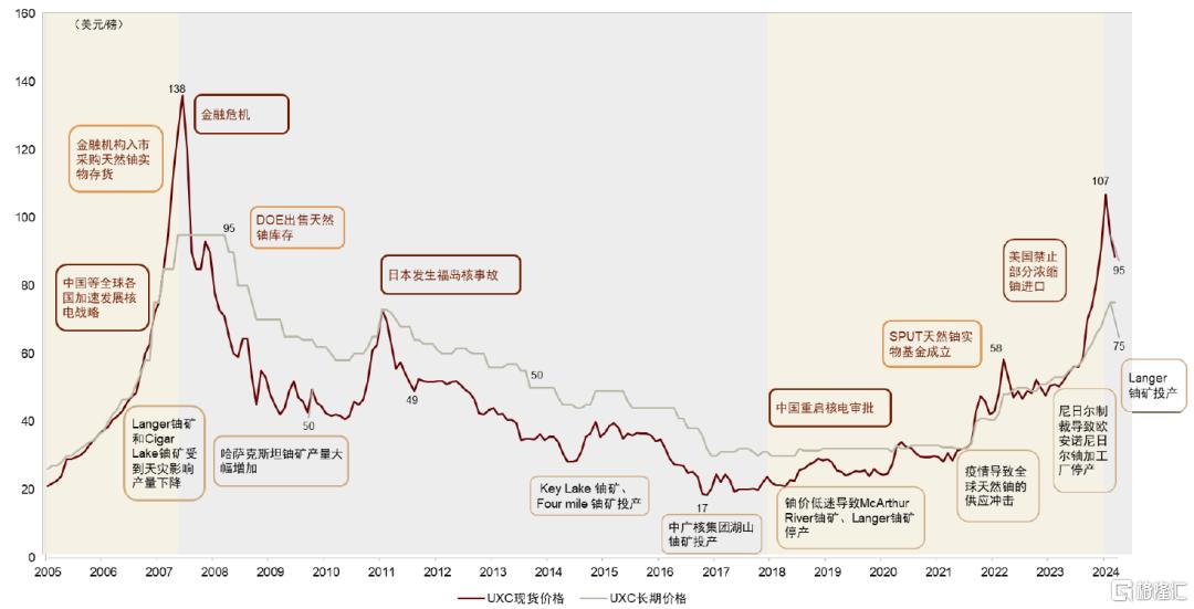 回顾过去二十年,天然铀价格在2007年达到138美元/磅的高点,经历了接近十年的漫长下行周期。站在当前时点,天然铀价格在2024年初达到107美元/磅后触顶回落,持续处于高位震荡的趋势,导致市场对于未来铀价的走势和节奏存在广泛的疑虑和分歧。因此,我们聚焦供需两侧以及金融机构和实物库存等影响因素,对历史铀价走势和重要事件进行复盘,以指导对未来铀价走势的判断: