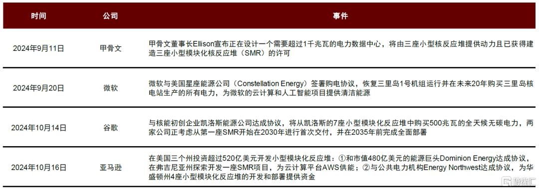 对比传统火电和风光等新能源发电,核电具有低碳安全、稳定性强、能量密度大、长期运行成本低的综合优势,是为AI数据供能的合适选择。2024年9月,微软与能源公司Constellation宣布合作计划,规划重启三里岛核电站1号机组为数据中心提供电力[11],反映了科技巨头开始着手核电布局。