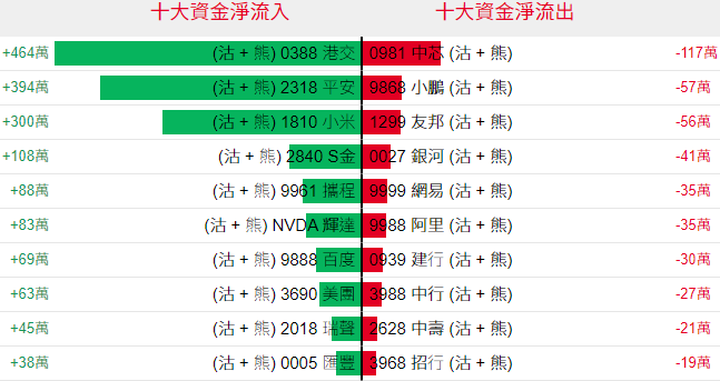 淡仓(认沽证及熊证)方面,近5日合计,港交所相关淡仓录得464万资金净流入,中国平安、小米分别录得394万、300万港元资金净流入部署;中芯国际、小鹏相关淡仓分别录得117万、57万港元资金净流出。
