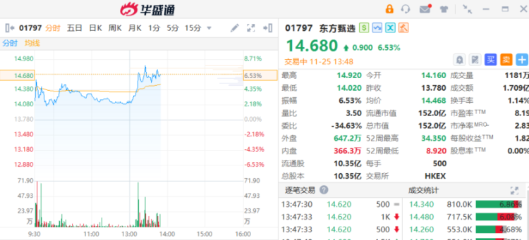 东方甄选 $01797.HK 涨超6%,截至发稿,涨6.53%,报14.68港元,成交额1.70亿港元。