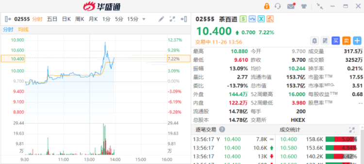 茶百道 $02555.HK 午后涨超8%,截至发稿,涨7.22%,报10.4港元,成交额23252万港元。