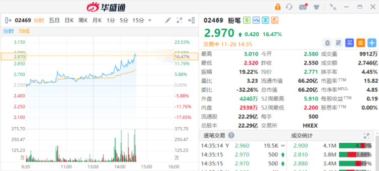 粉笔 $02469.HK 涨超16%,截至发稿,涨16.47%,报2.97港元,成交额2.74亿港元。