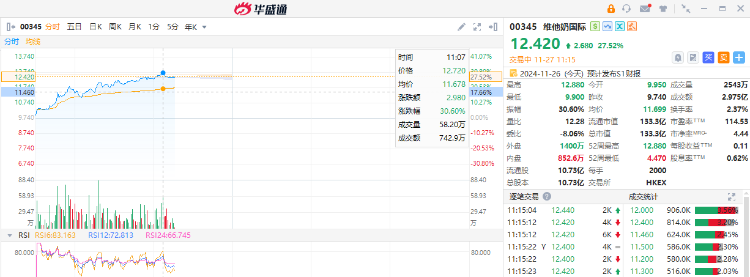 维他奶国际( $00345.HK )涨涨幅扩大逾30%,现报12.42港元,成交额近3亿港元。公司中期纯利同比增长5%,黄氏家族黄志达持股比例攀升至12.26%。