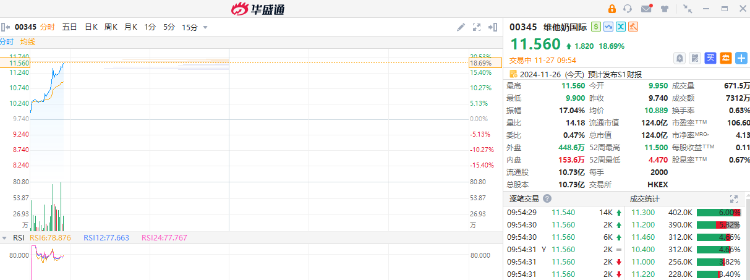 维他奶国际(00345)早盘持续走高,股价上涨18.69%,现报11.56港元,成交额7312万港元。