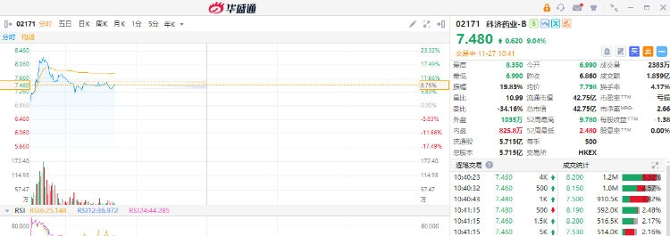 随着2024年国家医保药品目录公布临近,港股医药股多数走强。截至发稿,科济药业-B(02171.HK)、诺诚健华(09969.HK)、科伦博泰生物-B(06990.HK)、康诺亚-B(02162.HK)分别上涨9.04%、9.18%、4.66%、3.67%。