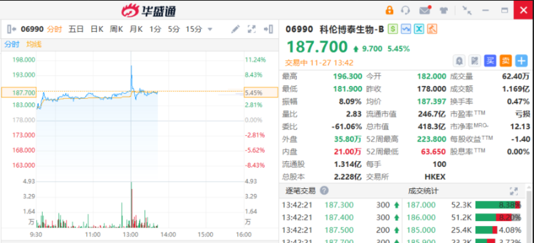 科伦博泰生物-B $06990.HK 午后一度飙升逾10%,截至发稿,涨5.45%,报187.7港元,成交额1.16亿港元。