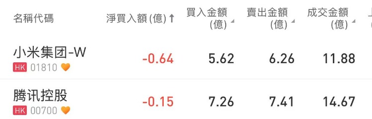 小米集团-W、腾讯控股分别获南下资金净卖出0.64亿港元、4.21亿港元、0.15亿港元。