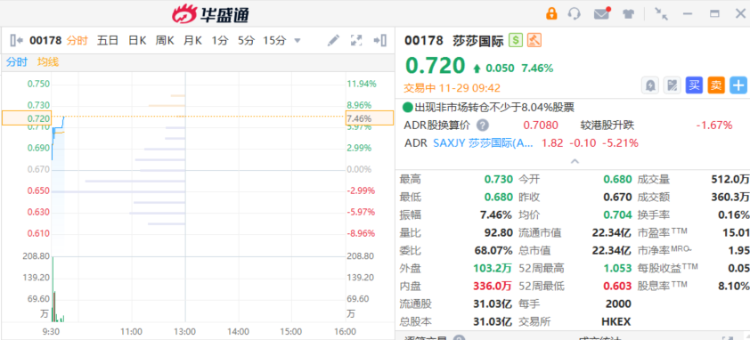 莎莎国际 $00178.HK 涨超7%,截至发稿,涨7.46%,报0.72港元,成交额360万港元。