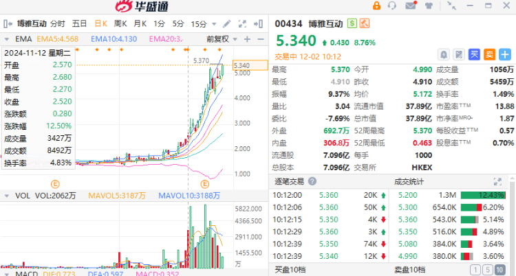 12月2日讯,港股加密货币股集体走高,博雅互动(00434)再涨超8%,截至发稿,报5.34港元,成交额5459万港元。