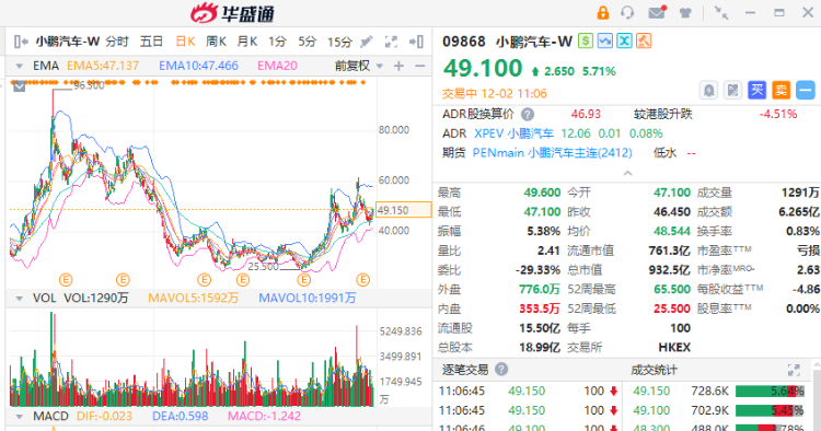 小鹏汽车-W(09868)早盘持续走高,股价上涨5.71%,现报49.10港元,成交额6.26亿港元。