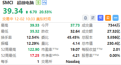 华盛资讯12月2日消息,超微电脑盘中涨幅扩大,现涨超20%,报39.34美元。
