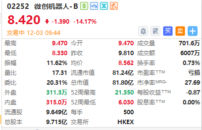 微创机器人大跌14%,拟折价近20%配售3470万股,净筹约2.66亿港元。