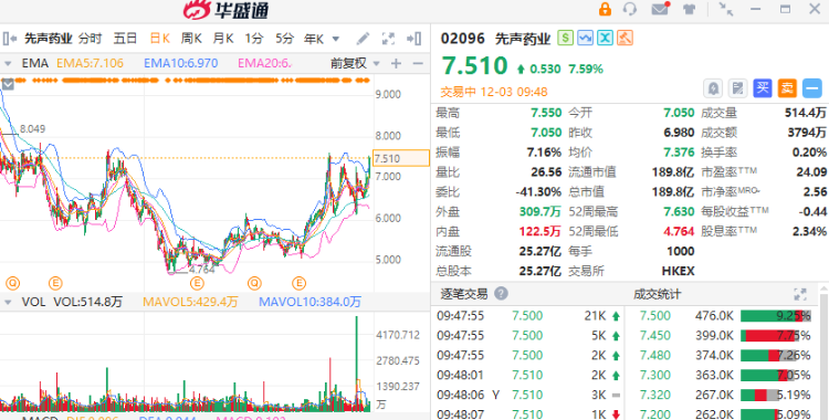 12月3日讯,先声药业(02096)早盘涨近8%,截至发稿,涨7.59%,报7.51港元,成交额3794万港元。