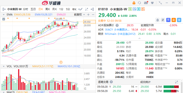 华盛资讯12月3日讯,港股汽车产业链股早盘活跃,小米集团-W逆势大涨逾2.8%,汽车街涨超5%,比亚迪涨近1%。