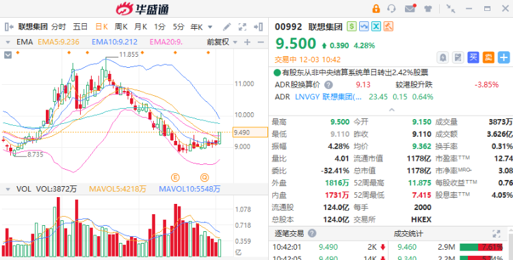 12月3日讯,港股联想集团(00992)涨超4%,截至发稿,涨报9.5港元,成交额3.62亿港元。