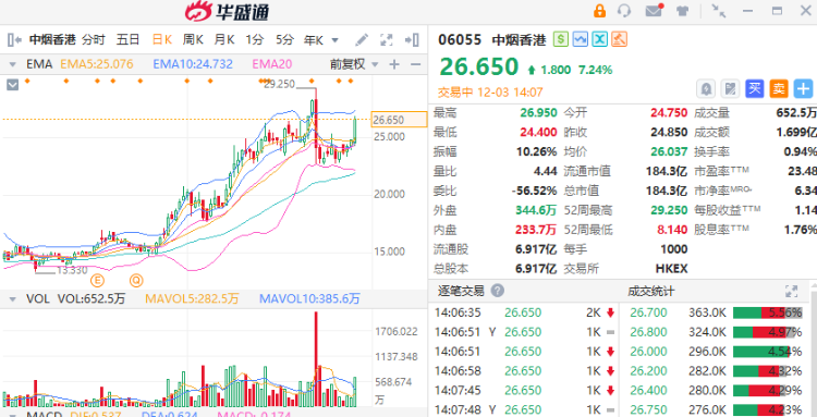 中烟香港(06055)涨超7%,截至发稿,报26.65港元,成交额1.70亿港元。