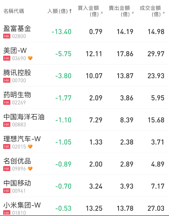 盈富基金、美团-W、腾讯控股分别遭南下资金净卖出13.40亿港元、5.75亿港元、3.80亿港元。