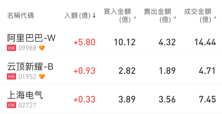 阿里巴巴-W、云顶新耀-B、上海电气分别获南下资金净买入5.8亿港元、0.93亿港元、0.33亿港元。