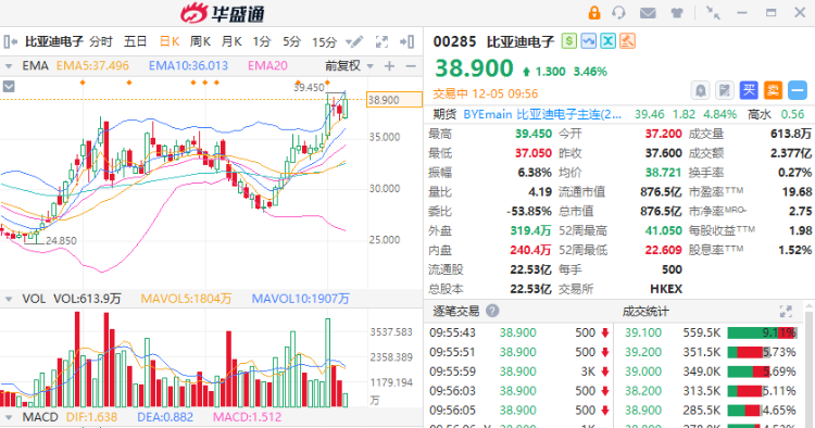 比亚迪电子(00285)盘初逆市上行,现升3.46%,现报价38.9港元,截至发稿,成交额2.38亿港元。