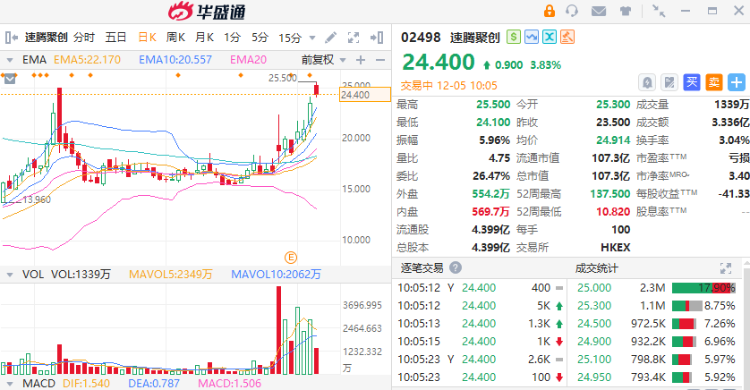 华盛资讯12月5日讯,港股早盘低开低走,恒指、科指均跌超1%。多只AI概念股获资金逆势抢购,汇量科技、第四范式涨超5%,晶泰科技、速腾聚创涨超4%。