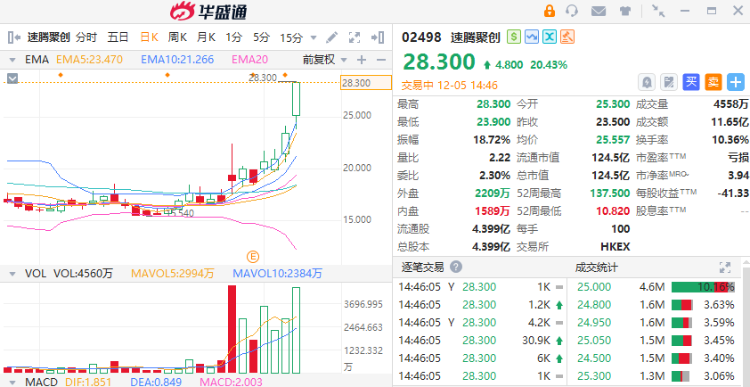 12月5日讯,港股速腾聚创(02498)延续近期强劲走势,今日午后继续发力,截至发稿,报28.3港元,涨20%,成交额11.65亿港元。该股近4个交易日累计涨幅达50%。