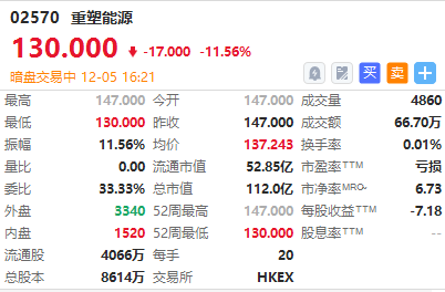 华盛资讯12月05日讯,港股重塑能源正在暗盘交易中,截至发稿跌11.56%,报130.00港元/股,中签一手账面浮亏340港元,最新总市值超112.01亿港元。该股预计将于12月6日正式挂牌上市,配售结果将于今日晚间披露。