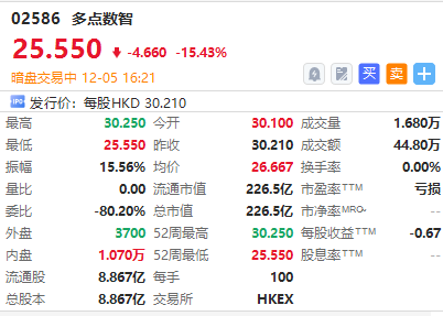港股多点数智正在暗盘交易中,截至发稿跌15.43%,报26.00港元/股,中签一手账面浮亏466港元,最新总市值超226亿港元。该股预计将于12月6日正式挂牌上市,配售结果将于今日晚间披露。