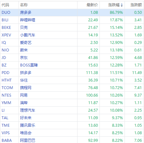 其中,房多多涨超86%,哔哩哔哩涨超17%,小鹏汽车、蔚来涨超13%,京东涨超12%,拼多多涨超11%,理想汽车涨超10%,阿里涨超8%。