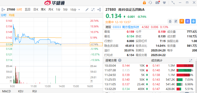 另外,多只股份跟随大市掉头,甚至转跌,有部份投资者倾向以指数ETF的认股证作部署。想部署科指走势,可以留意科指ETF(03033) $03033.HK 认购证(27880) $27880.HK ,行使价6港元,明年4月底到期,实际杠杆约7.3倍; 反向部署,可以留意科指ETF认沽证(28223) $28223.HK ,行使价4.033港元,明年4月底到期,实际杠杆约5.1倍。