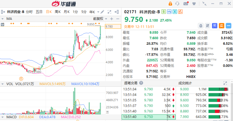 科济药业-B(02171)今日急升27%,报9.75港元,成交额3.3亿港元。