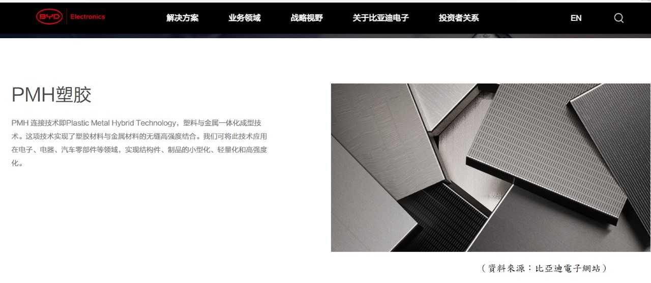 例如在几年前,比亚迪电子研发出塑胶与金属的纳米混融技术(plastic-metal hybrid,简称PMH),并实际应用在机壳及部件上,生意不断上升。