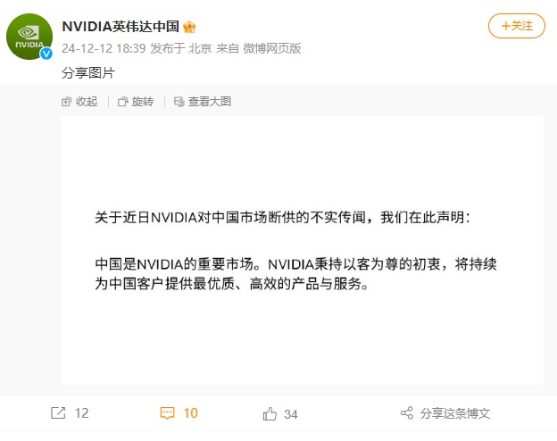 英伟达中国官方微博发声明,称近日社交媒体上传英伟达断供中国为不实传闻。公司表示,中国是NVIDIA重要的市场,未来将持续为中国客户提供高质量服务。