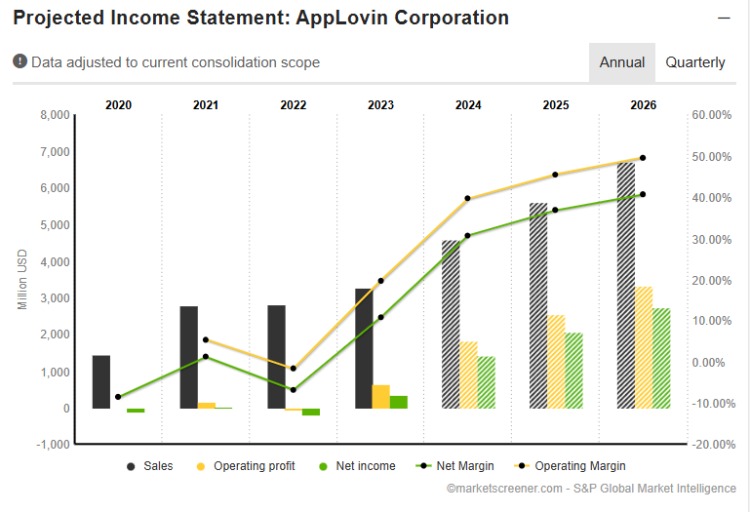 随着覆盖人工智能硬件基础设施以及AI大模型方面的AI算力资源与应用软件端部署逐渐成型,AppLovin开始为全球企业提供基于人工智能技术的“AI+广告营销方案”,涵盖包括用户触达、流量变现、广告创意设计、营销数据检测等功能的广告营销生态。11月7日,AppLovin发布的三季报大超市场预期,单季营收约为11.98亿美元,同比增长39%;净利润则高达4.34亿美元,同比猛增300%,该公司甚至预计年度营业利润率有望翻番。