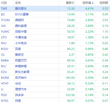 其中,腾讯音乐涨超4%,Boss直聘涨超3%,百度、阿里、拼多多小幅上涨。