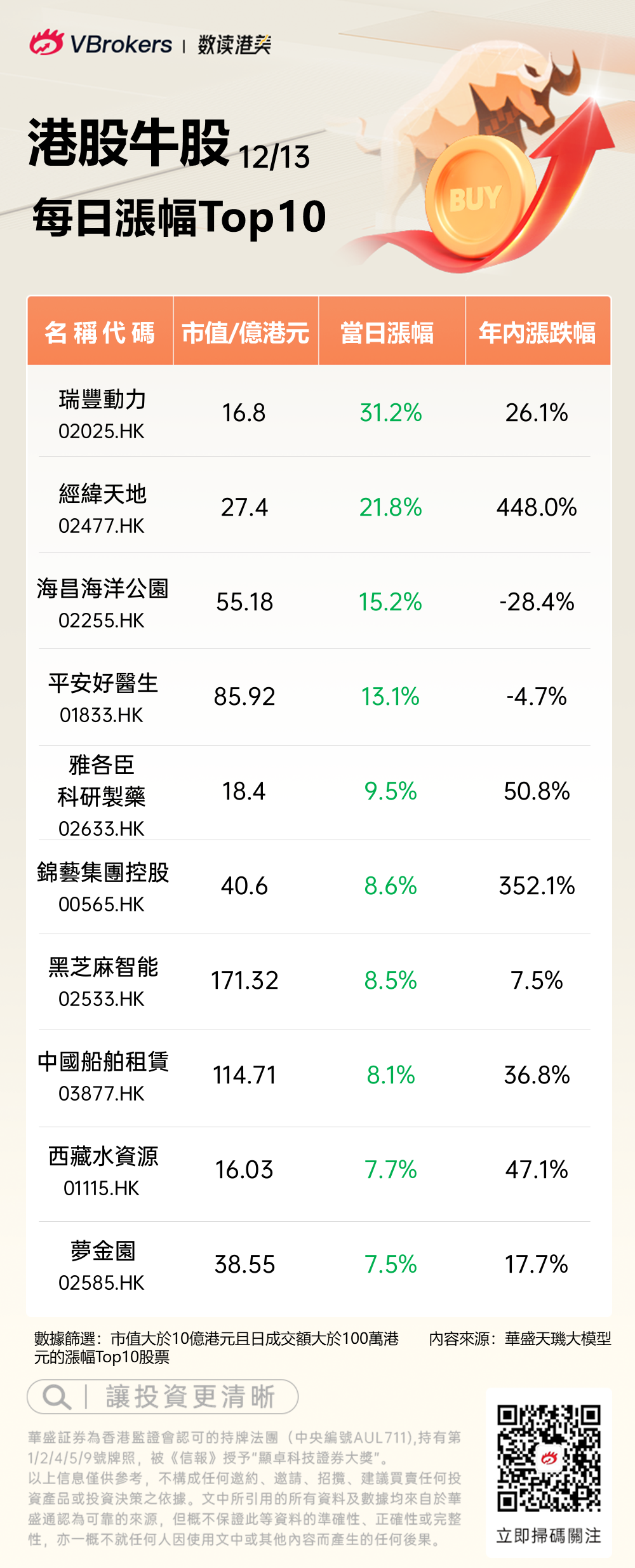發仔统计了每日港股涨幅Top10,具体名单如下: