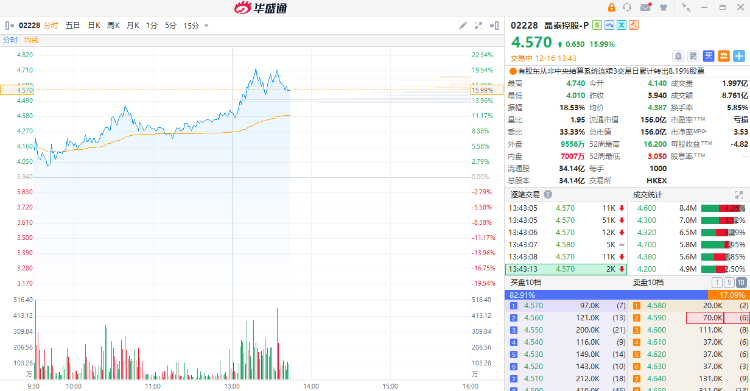 晶泰控股-P $02228.HK 今日高开高走,午后涨幅一度扩大至20%,截至发稿,涨15.88%,报4.57港元,成交额8.76亿港元。