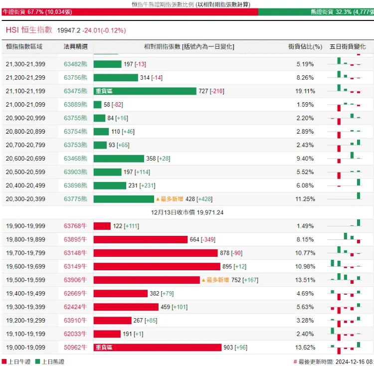 过去一周,恒指牛证合计约209万港元资金净流出;恒指熊证则约5376万港元资金净流入。街货分布方面,至上周五,恒指牛证街货主要在收回价19500点至19999点之间,累计相当约3311张期指合约;恒指熊证街货在收回价21100点至20399点之间,累计相当约2286张期指合约。