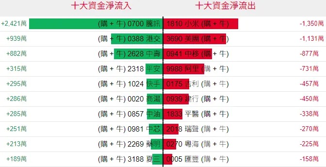 好仓(认购证及牛证)方面,过去一周,腾讯相关好仓获2421万港元资金净流入部署,港交所、中国人寿也分别录得939万、882万资金净流入;小米相关好仓录得1350万港元资金净流出套现,美团、中国移动相关好仓也分别获1131万、877万港元资金净流出了结。