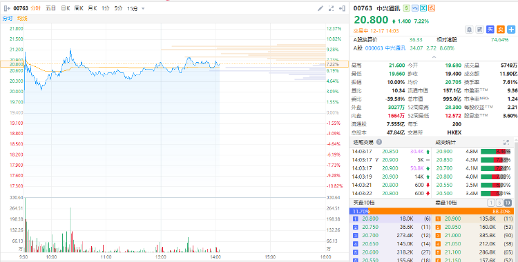 今天早盘,中兴通讯可以说充当了市场主流品种的角色。中兴通讯A股一度涨停,成交额超100亿元;港股中兴通讯 $00763.HK 一度拉涨超9%。