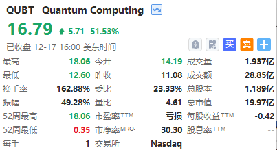 截至收盘,Quantum Computing涨超51%,续刷历史新高,周内累计大涨150%。