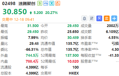 速腾聚创( $02498.HK )拉升逾20%,报30.85港元,成交额6.1亿港元。