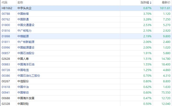 基建中,中国铁塔(00788.HK)、中国中车(01766.HK)、中国交通建设(01800.HK)、中国中铁(00390.HK)分别上涨3.7%、3.49%、2.53%、2.18%。