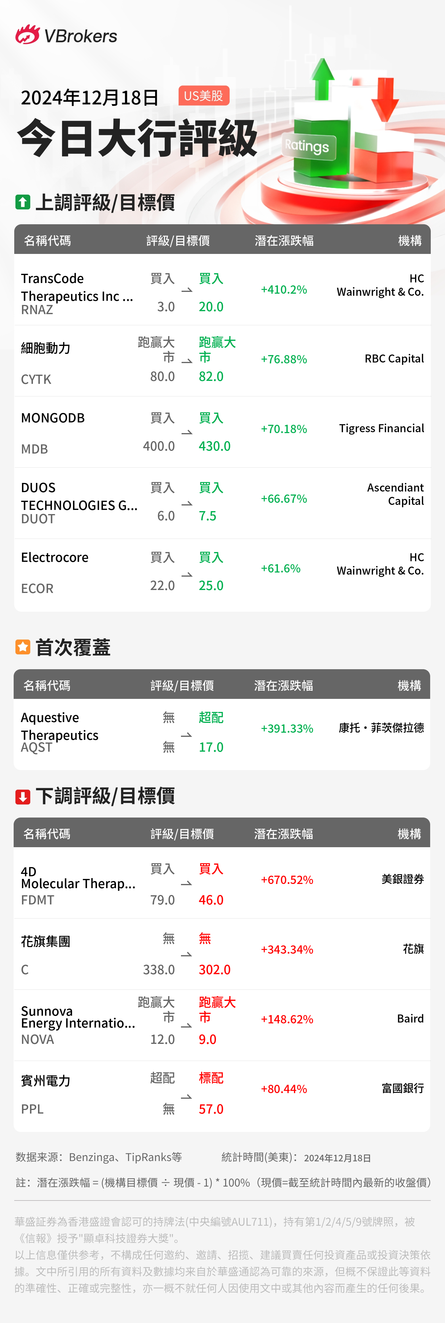 | TransCode Therapeutics Inc Ordinary Shares | RNAZ | 上调 | $20.0 | $3.92 | 410.2% | HC Wainwright & Co. |