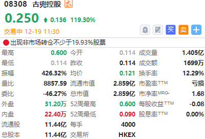 古兜控股(08308)盘中一度飙升逾420%,成交量异常放大并创历史新高。截至发稿,股价上涨119.3%,现报0.25港元,成交额1699万港元。