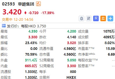 草姬集团( $02593.HK )跌幅扩大逾18%,盘中低见3.38港元,跌穿发行价3.75港元。截至发稿,跌17.39%,报3.42港元,成交额4095万港元。