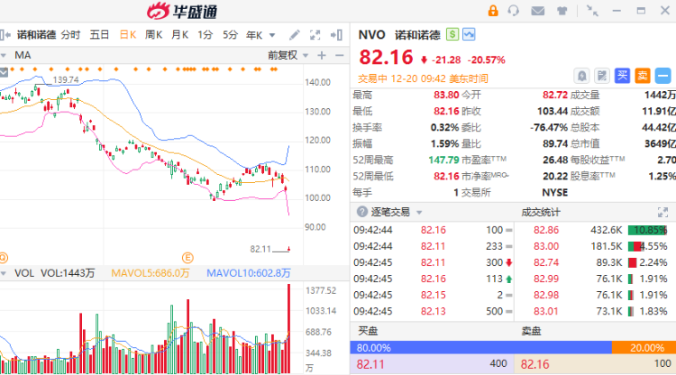 华盛资讯12月20日消息,美股三大指数周五低开震荡,礼来逆势大涨逾6%;竞争对手诺和诺德暴跌20%,下一代减肥药数据不及预期。