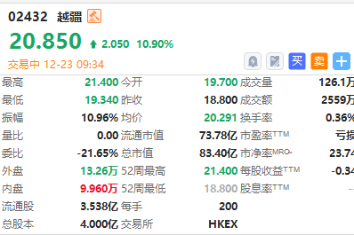 华盛资讯12月23日讯,港股越疆今日挂牌,截至发稿涨10.9%,报20.85港元/股,中签一手账面浮盈410港元,最新总市值超83亿港元。该股此前公开发售获9.25倍认购,一手中签率50.0%。