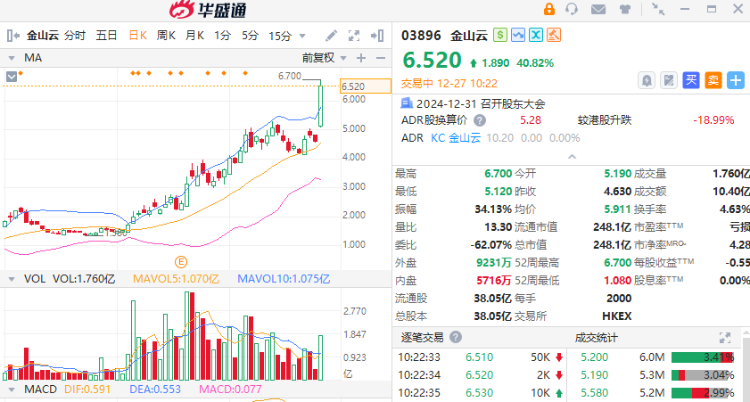 12月27日讯,港股金山云高开高走,截至发稿,股价上涨41%,自11月以来涨幅超430%。