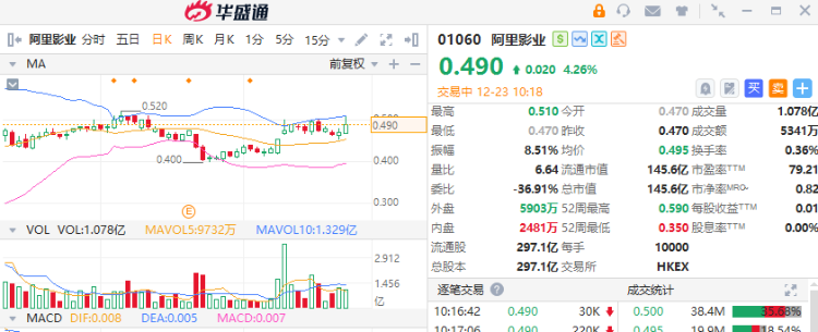 阿里影业(01060)早盘一度涨超8%,截至发稿,股价上涨4.26%,现报0.49港元,成交额5179.55万港元。